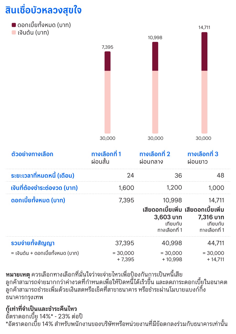 เลือกแบบไหนดี ? “เลือกผ่อนสั้น ประหยัดดอกเบี้ยได้อีกเยอะ” หากเลือกแผนชำระแบบผ่อนสั้น (ผ่อนน้อยเดือน) แม้ว่ายอดผ่อนต่อเดือนจะสูงกว่า แต่จะช่วยประหยัดดอกเบี้ยรวมตลอดสัญญาได้อย่างมาก เนื่องจากตัดเงินต้นได้ในจำนวนที่มากกว่า กลับกันหากเลือกการชำระแบบผ่อนยาว (ผ่อนหลายเดือน) ยอดดอกเบี้ยรวมตลอดสัญญาก็จะเพิ่มสูงขึ้น ซึ่งนำไปสู่การปลดหนี้ที่ช้าลง