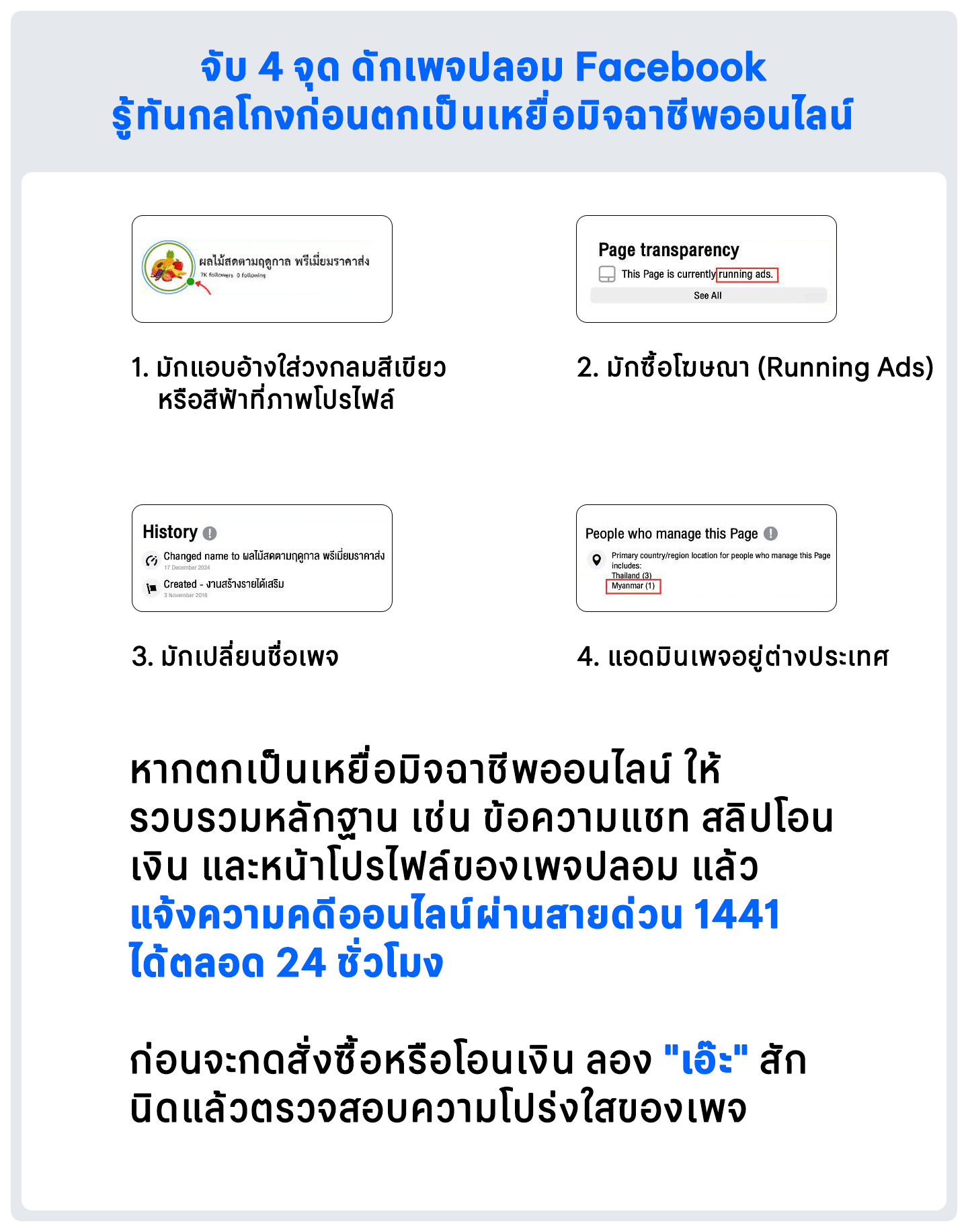 - ก่อนกดสั่งซื้อหรือโอนเงิน ควรตรวจสอบให้แน่ใจทุกครั้งว่าปลายทางเข้าข่ายมิจฉาชีพหรือไม่ โดยสังเกตจาก 4 จุดตาย เพจปลอม Facebook