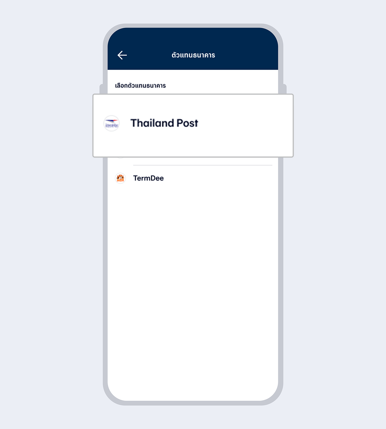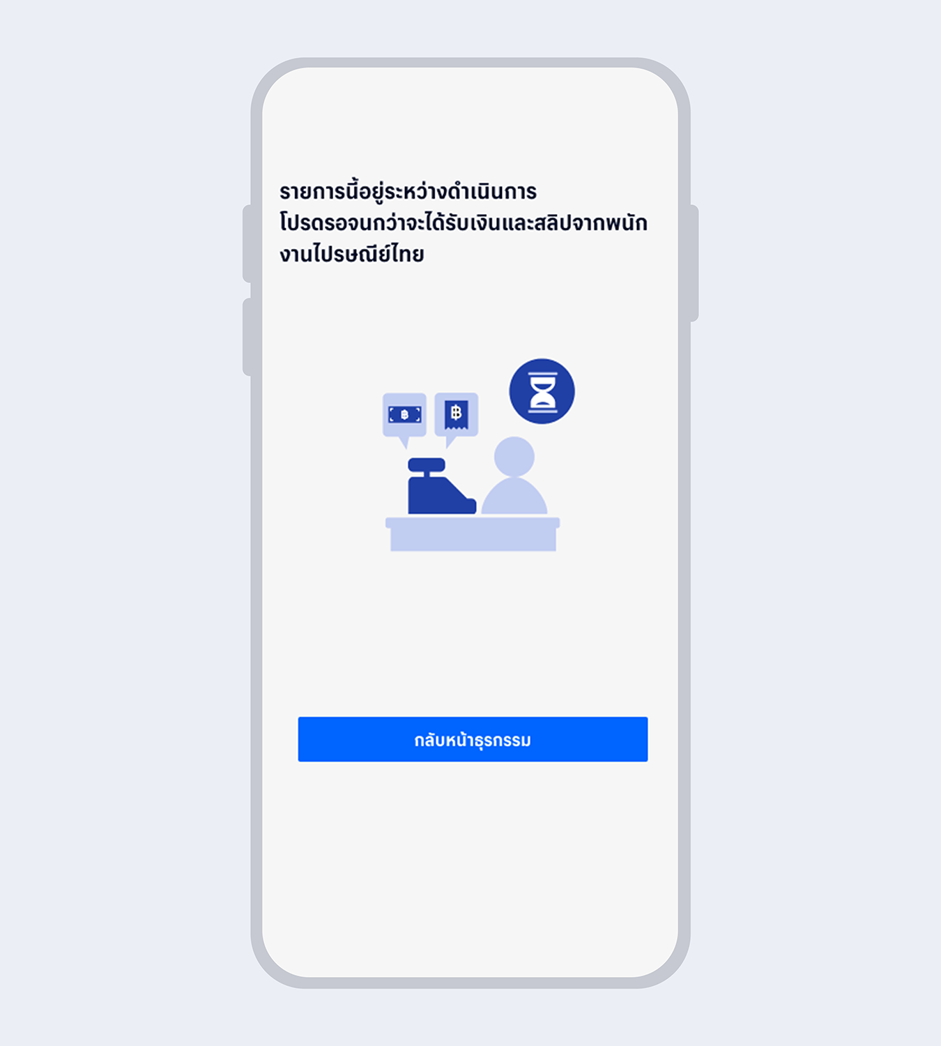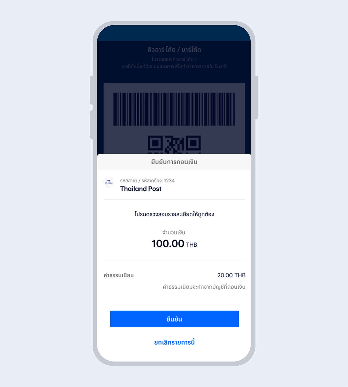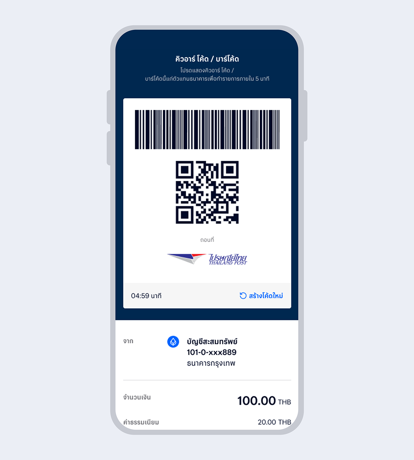 ระบบจะแสดงหน้าจอคิวอาร์โค้ด/บาร์โค้ด (มีอายุ 5 นาที) เพื่อให้ตัวแทนธนาคารทำการสแกน จากนั้นดำเนินการตามขั้นตอนของตัวแทนธนาคาร ที่ไปรษณีย์ไทย