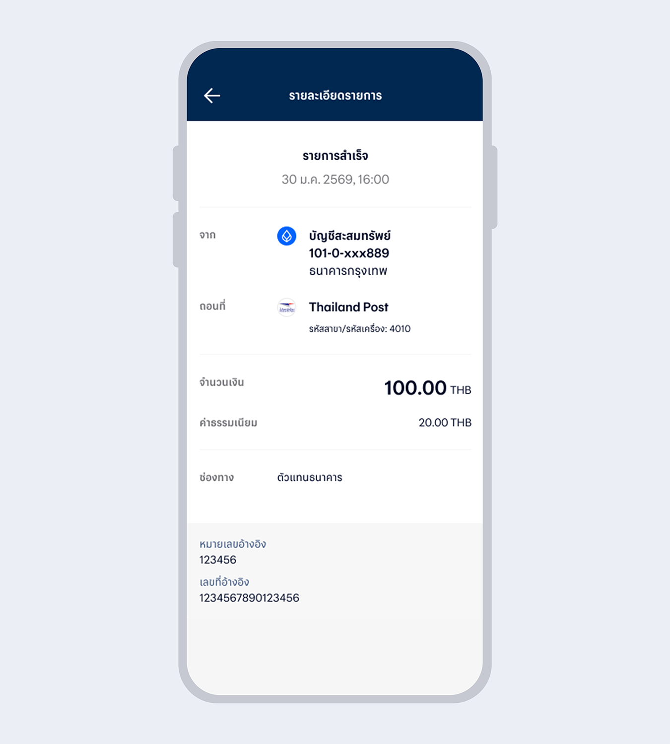 เมื่อทำรายการสำเร็จ คุณจะได้รับเงินสด และใบบันทึกรายการถอนเงินจากไปรษณีย์ไทย โดยสามารถตรวจสอบการทำรายการได้ที่เมนู “ประวัติการทำรายการ”