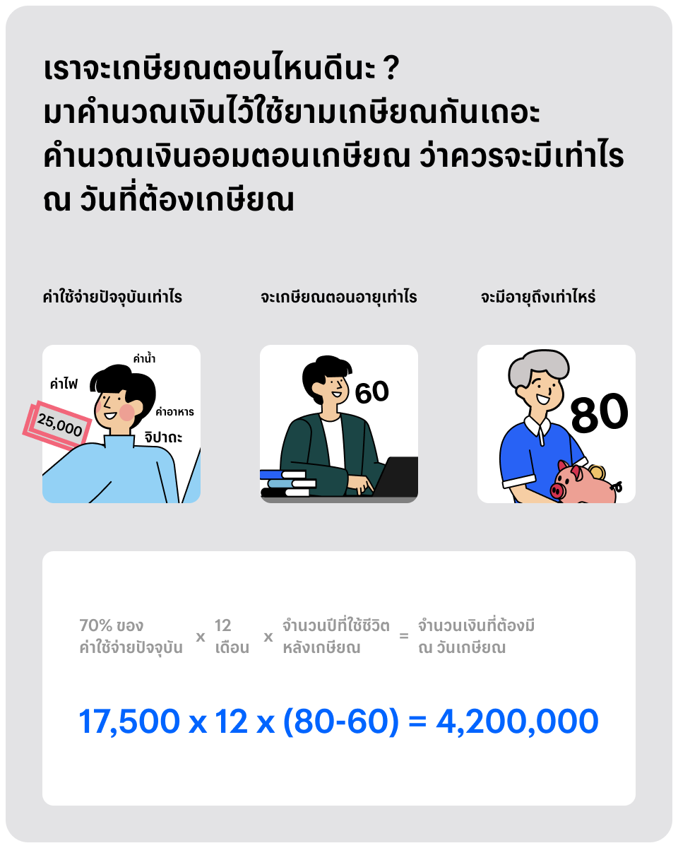ยกตัวอย่างเช่น เราตั้งเป้าไว้ว่าจะเกษียณตอนอายุ 60 ปี และคาดว่าจะมีชีวิตอยู่หลังเกษียณอายุไปอีก 20 ปี (อายุ 80) โดยเรามีค่าใช้จ่ายปัจจุบันอยู่ที่ 25,000 บาทต่อเดือน ค่าใช้จ่ายหลังเกษียณก็จะเท่ากับ 17,500 บาทต่อเดือน (70% x 25,000) หรือ 210,000 บาทต่อปี จากนั้นก็คูณกับจำนวนปีที่คาดว่าจะใช้ชีวิตหลังเกษียณอายุ หรือ 210,000 x 20 ปี ก็จะออกมาเป็นเงินเกษียณคือ 4,200,000 บาท